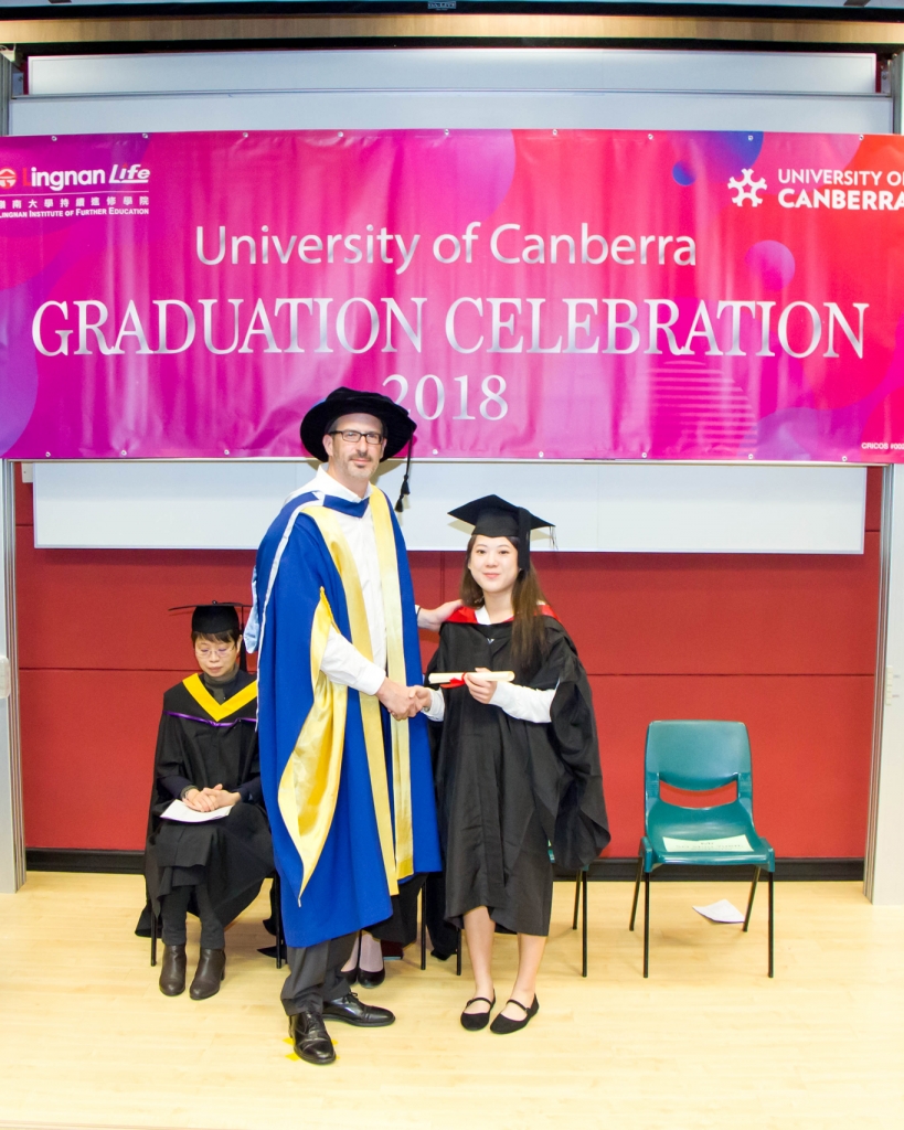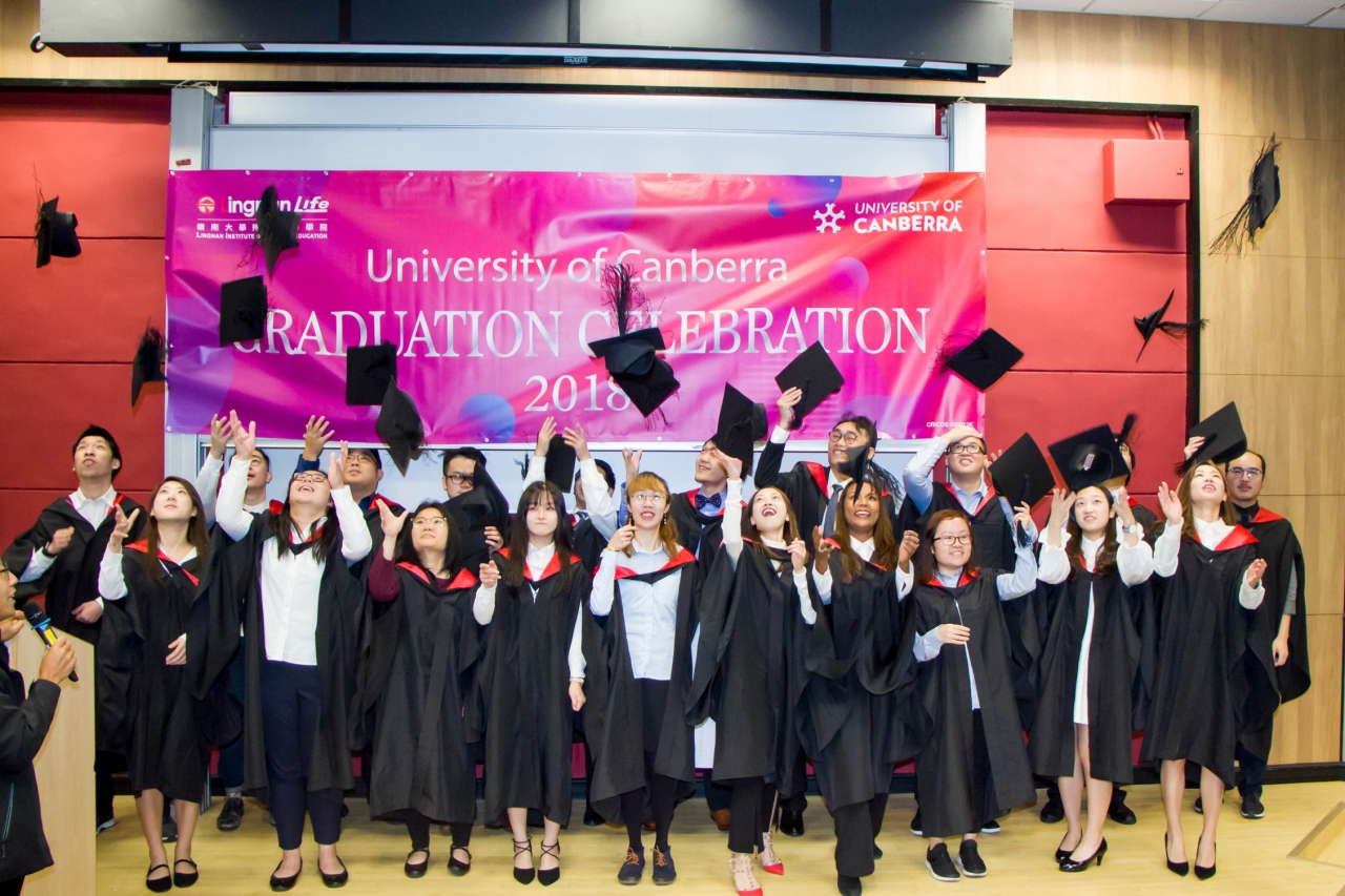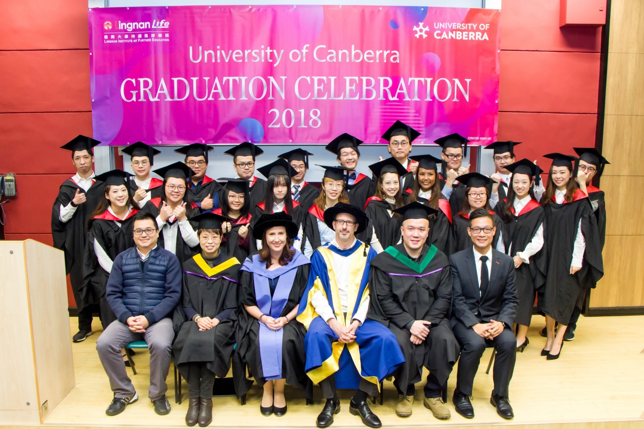 University of Canberra及岭南大学持续进修学院(学院)合办的衔接学士学位课程于二零一八年十二月十八日于岭南大学举行毕业典礼,由University of Canberra 的Mathieu O’Neil博士及Dimity Crisp博士亲临本港担任主礼嘉宾。二十六名文学士、心理及辅导学文学士、商业学学士、项目及旅游管理学学士毕业生获颁授毕业证书。