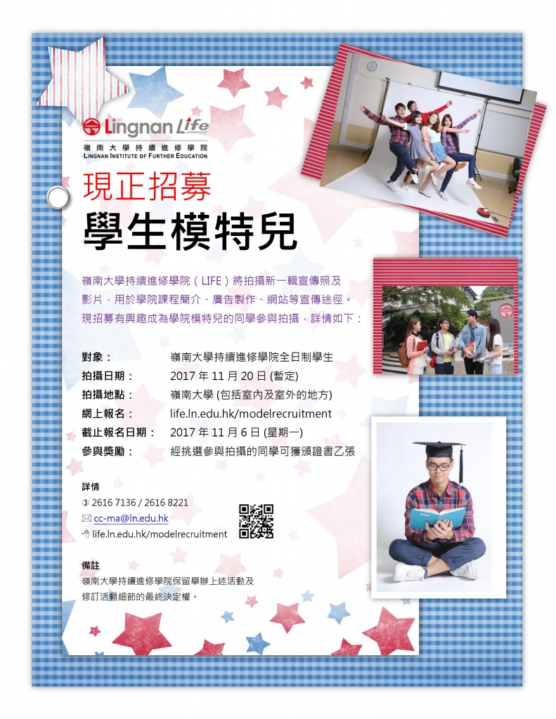 嶺南大學持續進修學院(LIFE)將拍攝新一輯宣傳照及影片,用於學院課程簡介、廣告製作、網站等宣傳途徑。現招募有興趣成為學院模特兒的同學參與拍攝,詳情如下: